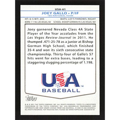 This is a 2011 USA Baseball Joey Gallo baseball card. The card is #USA-61 and pictures show condition.