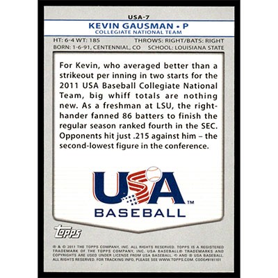 This is a 2011 USA Baseball Kevin Gausman baseball card. The card is #USA-7 and pictures show condition.