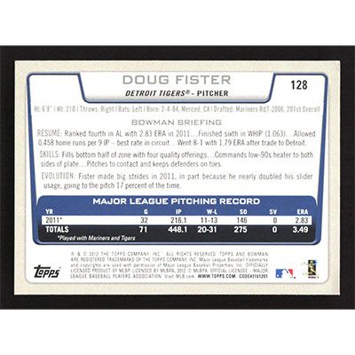 This is a 2012 Bowman Doug Fister baseball card. The card is #128 and pictures show condition.