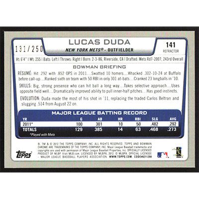 This is a 2012 Bowman Chrome Blue Refractors Lucas Duda baseball card. The card is #141 and pictures show condition. This card is limited; #'d 131/250.