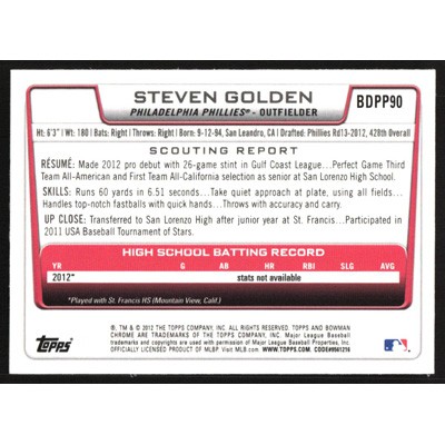 This is a 2012 Bowman Chrome Draft Draft Picks Steven Golden baseball card. The card is #BDPP90 and pictures show condition. Team(s): Philadelphia Phillies