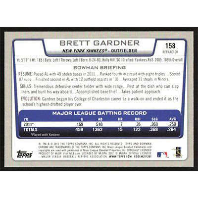 This is a 2012 Bowman Chrome Green Refractors Brett Gardner baseball card. The card is #158 and pictures show condition.