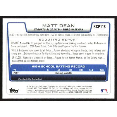 This is a 2012 Bowman Chrome Prospects Matt Dean baseball card. The card is #BCP118 and pictures show condition.