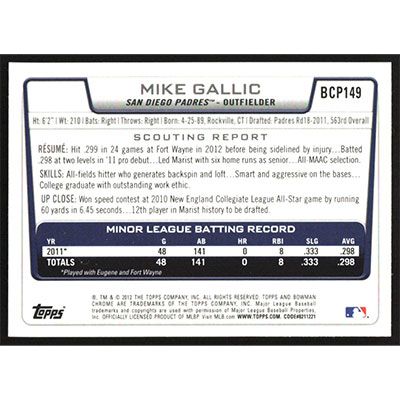 This is a 2012 Bowman Chrome Prospects Mike Gallic baseball card. The card is #BCP149 and pictures show condition.
