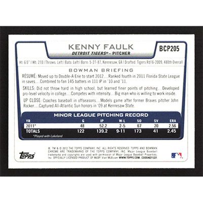 This is a 2012 Bowman Chrome Prospects Kenny Faulk baseball card. The card is #BCP205 and pictures show condition.