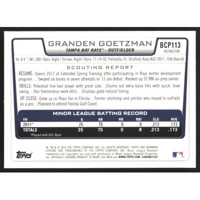 This is a 2012 Bowman Chrome Prospects Green Refractors Granden Goetzman baseball card. The card is #BCP113 and pictures show condition. Team(s): Tampa Bay Rays
