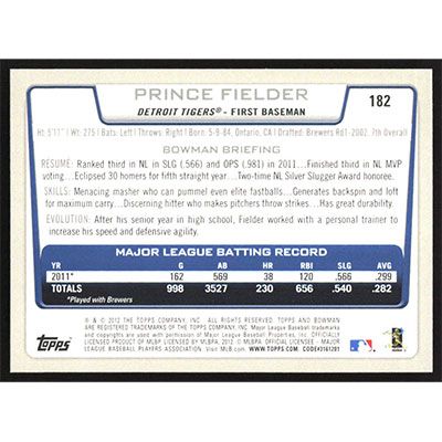 This is a 2012 Bowman Gold Prince Fielder baseball card. The card is #182 and pictures show condition.