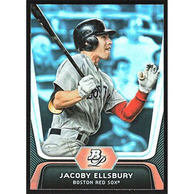 This is a 2012 Bowman Platinum Jacoby Ellsbury baseball card. The card is #100 and pictures show condition.