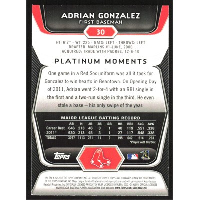This is a 2012 Bowman Platinum Adrian Gonzalez baseball card. The card is #30 and pictures show condition.