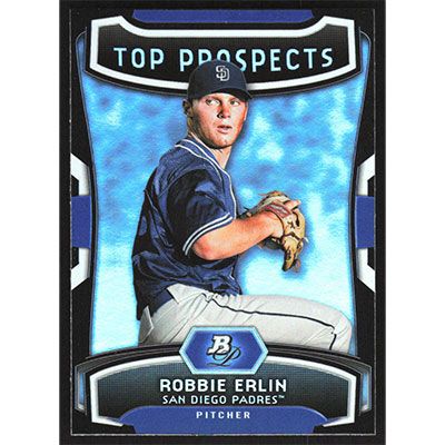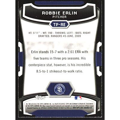 This is a 2012 Bowman Platinum Top Prospects Robbie Erlin baseball card. The card is #TP-RE and pictures show condition.