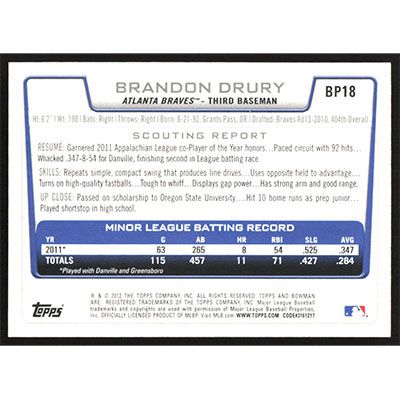 This is a 2012 Bowman Prospects Brandon Drury baseball card. The card is #BP18 and pictures show condition.