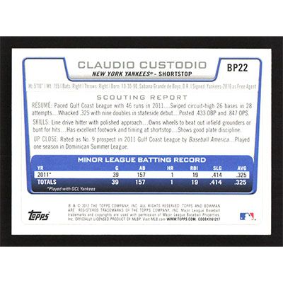 This is a 2012 Bowman Prospects Claudio Custodio baseball card. The card is #BP22 and pictures show condition.