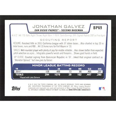 This is a 2012 Bowman Prospects Jonathan Galvez baseball card. The card is #BP69 and pictures show condition.