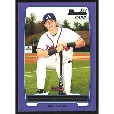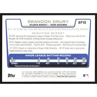 This is a 2012 Bowman Prospects Purple Brandon Drury baseball card. The card is #BP18 and pictures show condition.