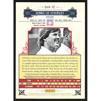 This is a 2012 Panini Cooperstown Dennis Eckersley baseball card. The card is #42 and pictures show condition.