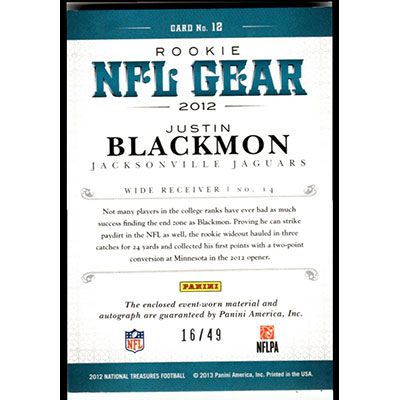 This is a 2012 Panini National Treasures NFL Gear Combos Signatures Justin Blackmon football card. This card has been signed, in blue, by Justin Blackmon, and is certified authentic by Panini. This card has a piece of event worn material, and a piece of football, embedded in it. The card is #12 and pictures show condition. This card is limited; #'d 16/49.