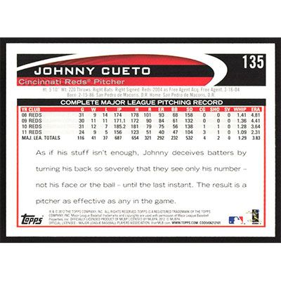 This is a 2012 Topps Johnny Cueto baseball card. The card is #135 and pictures show condition.