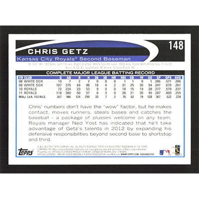 This is a 2012 Topps Chris Getz baseball card. The card is #148 and pictures show condition.