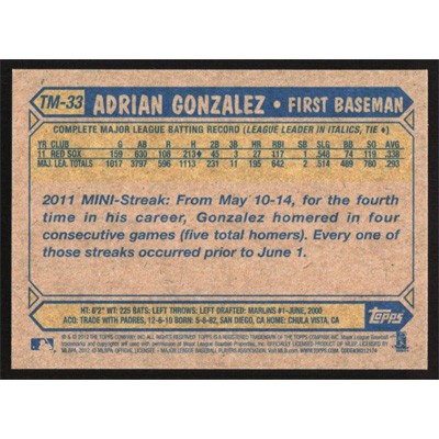 This is a 2012 Topps 1987 Minis Adrian Gonzalez baseball card. The card is #TM-33 and pictures show condition.