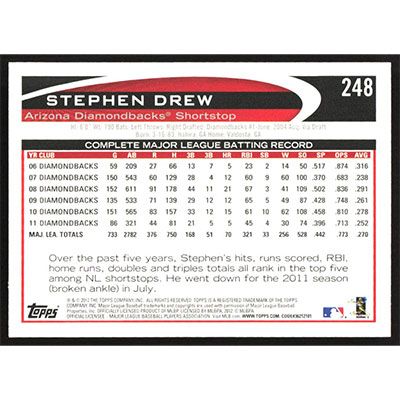 This is a 2012 Topps Stephen Drew autographed baseball card. This card has been signed, in blue, by Stephen Drew, and is guaranteed authentic by Ballcardz.com. The card is #248 and pictures show condition.