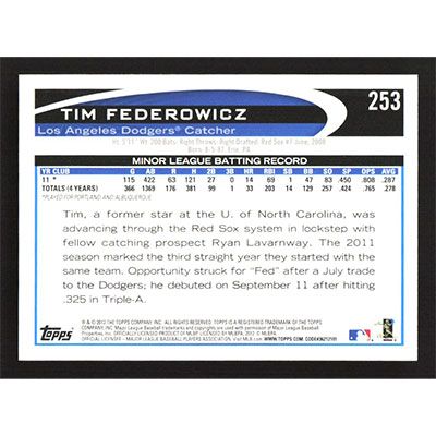 This is a 2012 Topps Tim Federowicz baseball card. The card is #253 and pictures show condition.