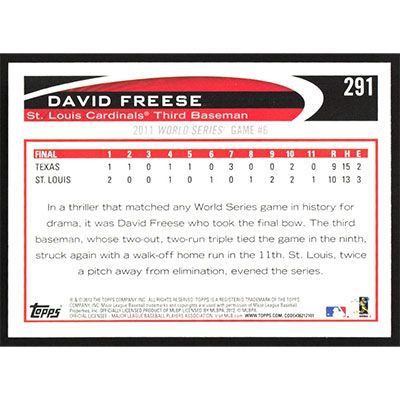 This is a 2012 Topps David Freese World Series Highlights baseball card. The card is #291 and pictures show condition.