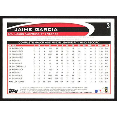 This is a 2012 Topps Jaime Garcia baseball card. The card is #3 and pictures show condition.