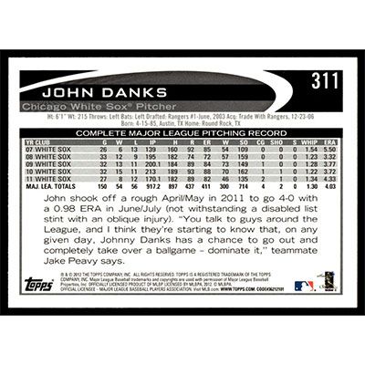 This is a 2012 Topps John Danks baseball card. The card is #311 and pictures show condition.