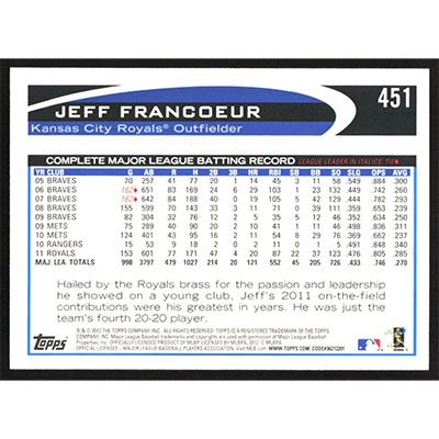 This is a 2012 Topps Jeff Francoeur autographed baseball card. This card has been signed, in blue, by Jeff Francoeur, and is guaranteed authentic by Ballcardz.com. The card is #451 and pictures show condition.