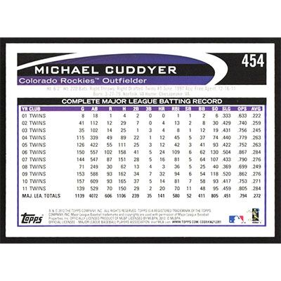 This is a 2012 Topps Michael Cuddyer baseball card. The card is #454 and pictures show condition.