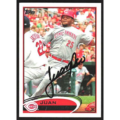 This is a 2012 Topps Juan Francisco autographed baseball card. This card has been signed, in black, by Juan Francisco, and is guaranteed authentic by Ballcardz.com. The card is #467 and pictures show condition.