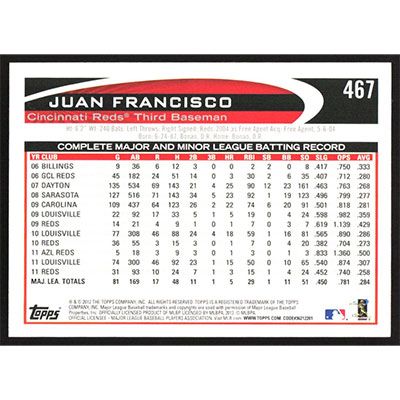 This is a 2012 Topps Juan Francisco baseball card. The card is #467 and pictures show condition.