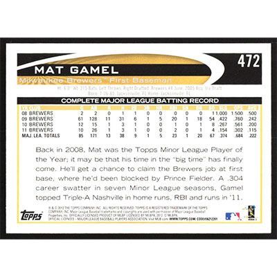 This is a 2012 Topps Mat Gamel baseball card. The card is #472 and pictures show condition.