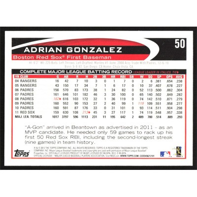 This is a 2012 Topps Adrian Gonzalez baseball card. The card is #50 and pictures show condition.