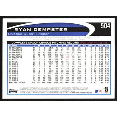 This is a 2012 Topps Ryan Dempster baseball card. The card is #504 and pictures show condition.