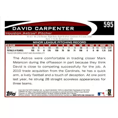 This is a 2012 Topps David Carpenter autographed baseball card. This card has been signed, in blue, by David Carpenter, and is guaranteed authentic by Ballcardz.com. The card is #595 and is in NM-MT condition.