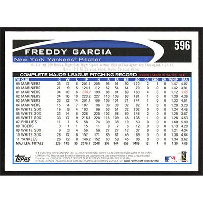 This is a 2012 Topps Freddy Garcia baseball card. The card is #596 and pictures show condition.