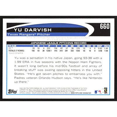This is a 2012 Topps Yu Darvish baseball card. The card is #660 and pictures show condition.