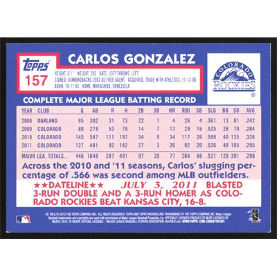 This is a 2012 Topps Archives Carlos Gonzalez baseball card. The card is #157 and pictures show condition.
