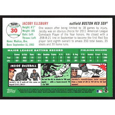 This is a 2012 Topps Archives Jacoby Ellsbury baseball card. The card is #30 and pictures show condition.