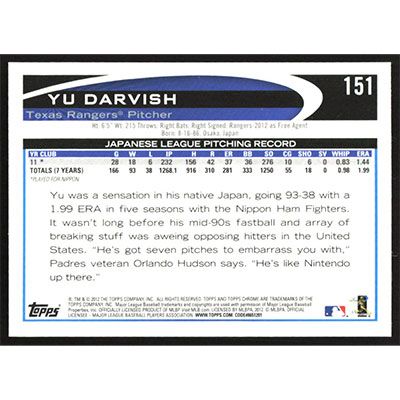 This is a 2012 Topps Chrome Yu Darvish baseball card. The card is #151 and pictures show condition.