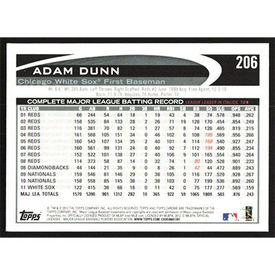This is a 2012 Topps Chrome Adam Dunn baseball card. The card is #206 and pictures show condition.