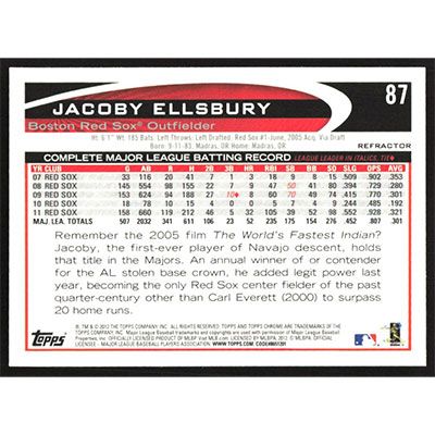 This is a 2012 Topps Chrome Refractors Jacoby Ellsbury baseball card. The card is #87 and pictures show condition.