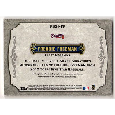 This is a 2012 Topps Five Star Silver Ink Autographs Freddie Freeman baseball card. The card is #FSSI-FF and pictures show condition. This card has been signed, in silver, by Freddie Freeman, and is certified authentic by Topps. This card is limited; #'d 09/99.