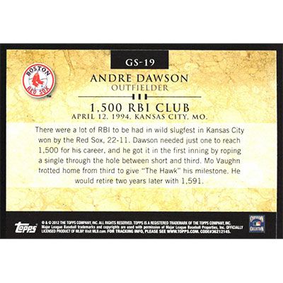 This is a 2012 Topps Gold Standard Andre Dawson baseball card. The card is #GS-19 and pictures show condition.