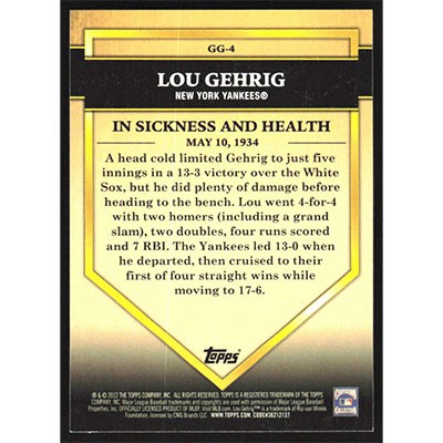 This is a 2012 Topps Golden Greats Lou Gehrig baseball card. The card is #GG-4 and pictures show condition.