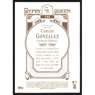 This is a 2012 Topps Gypsy Queen Carlos Gonzalez baseball card. The card is #142 and pictures show condition.