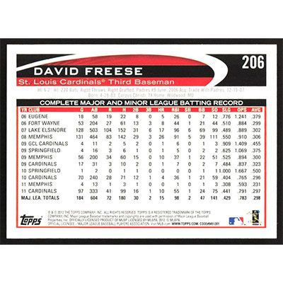 This is a 2012 Topps Opening Day David Freese baseball card. The card is #206 and pictures show condition.