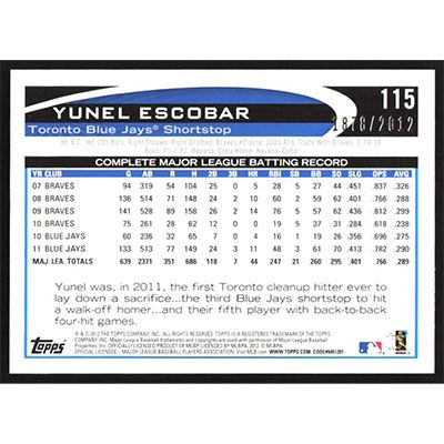 This is a 2012 Topps Opening Day Blue Yunel Escobar baseball card. The card is #115 and pictures show condition. This card is limited; #'d 1878/2012. Team(s): Toronto Blue Jays