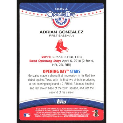 This is a 2012 Topps Opening Day Stars Adrian Gonzalez baseball card. The card is #ODS-4 and pictures show condition.